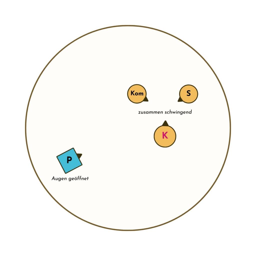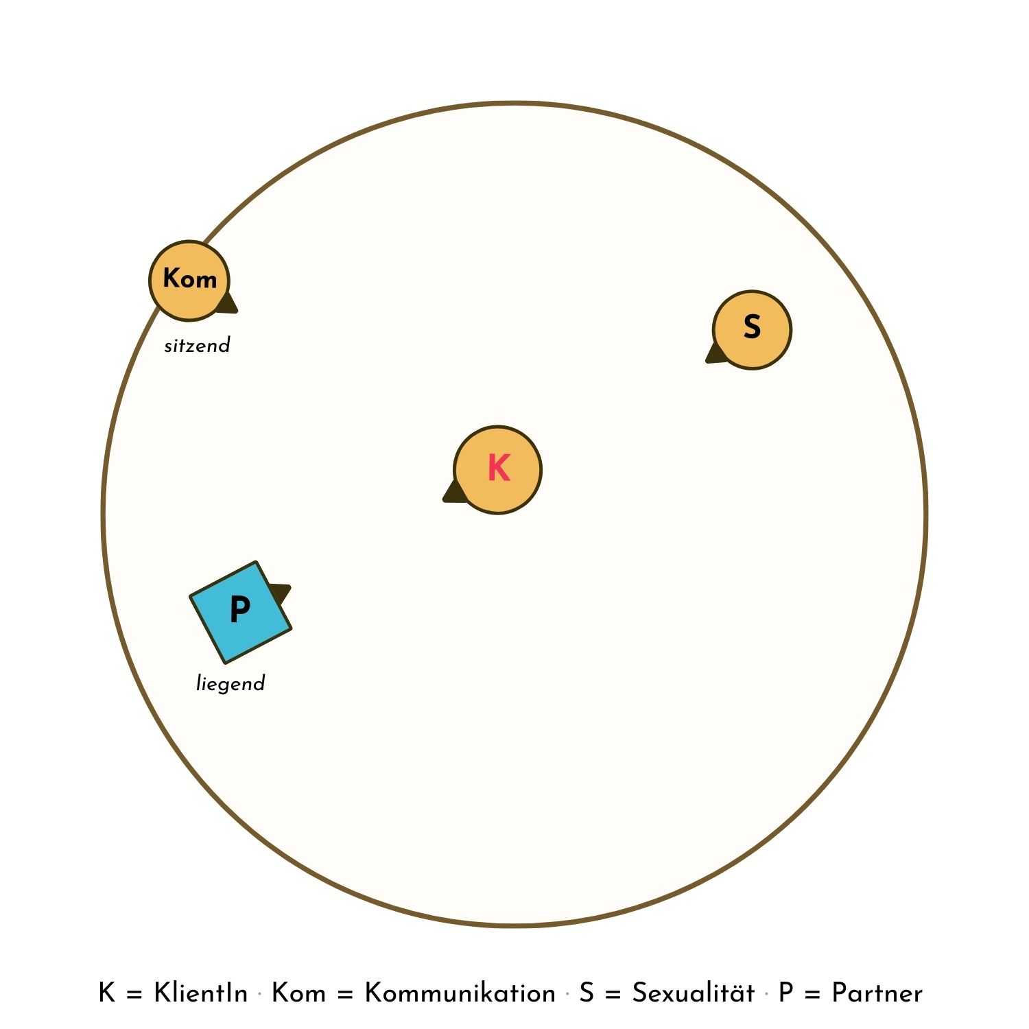 Hinter der Klientin, etwa drei Meter entfernt, stand die Stellvertreterin für Sexualität (S). Sie blickte auf den Rücken von K und war für P wie ausgeblendet, nicht sichtbar.