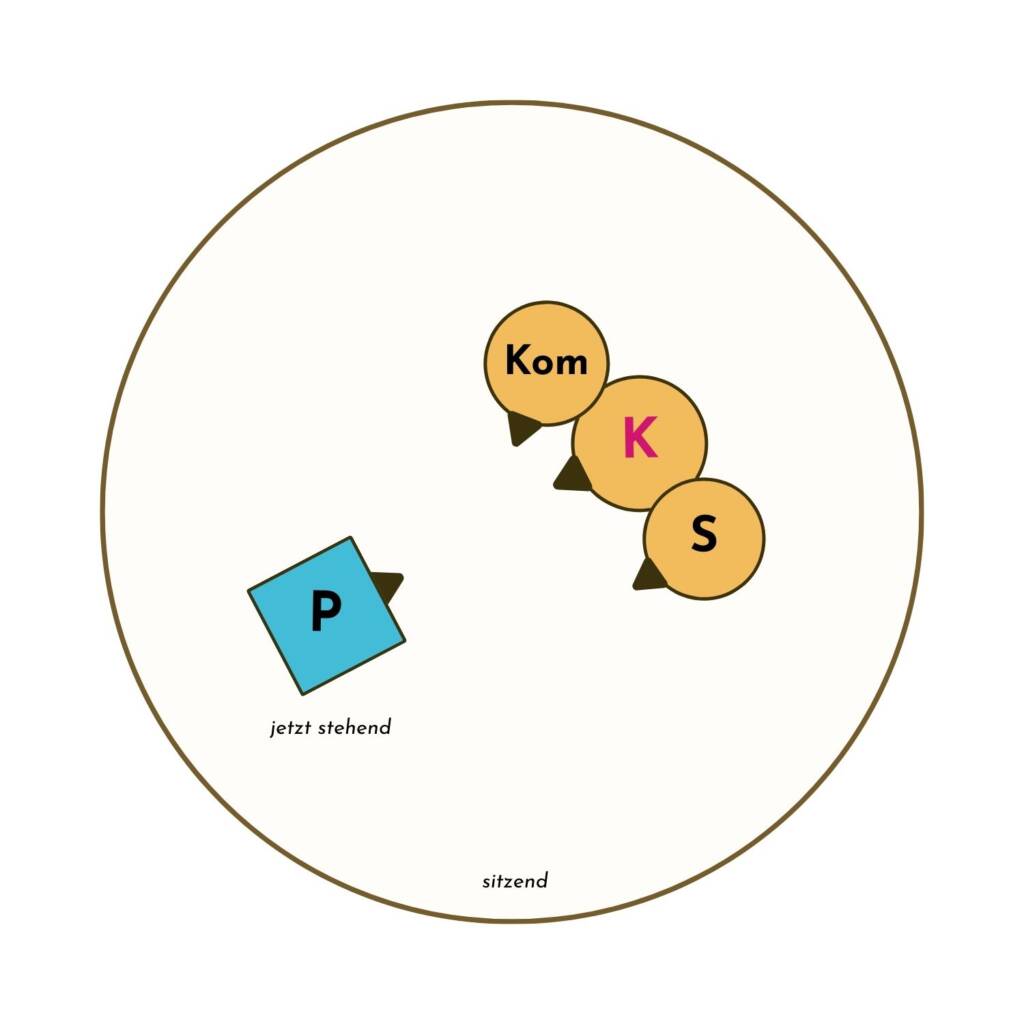 Die Stellvertreterin für die Klientin (K) stellte sich etwa in die Mitte des Raumes und wandte sich ihrem Partner (P) zu.